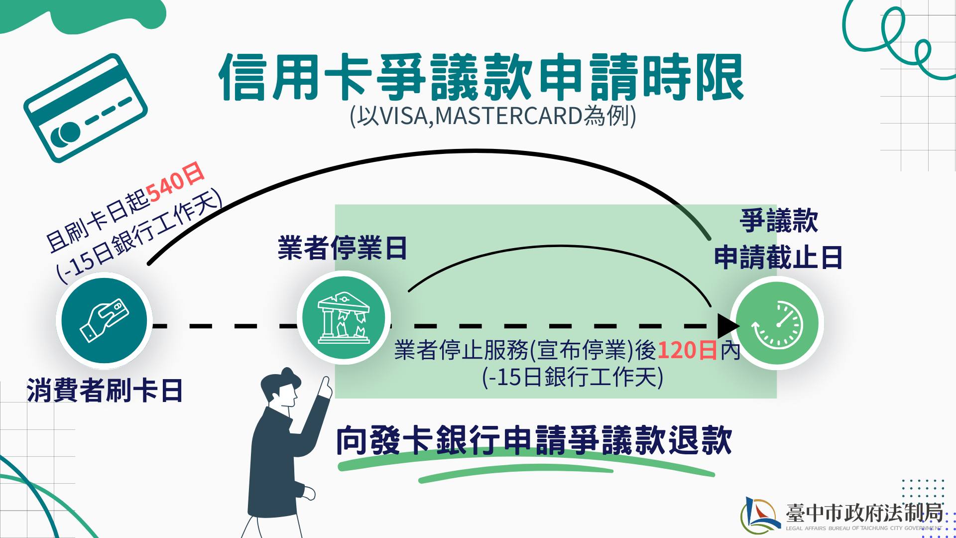 (1)因信用卡爭議款退費申請有期限限制,以VISA、MASTER信用卡為例,持卡消費者需自業者停止提供服務日起120個日曆天內,「且」需在消費日起540個日曆天內,就未接受的服務範圍內,檢附具體事證向發卡銀行申請爭議。